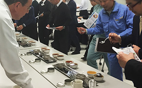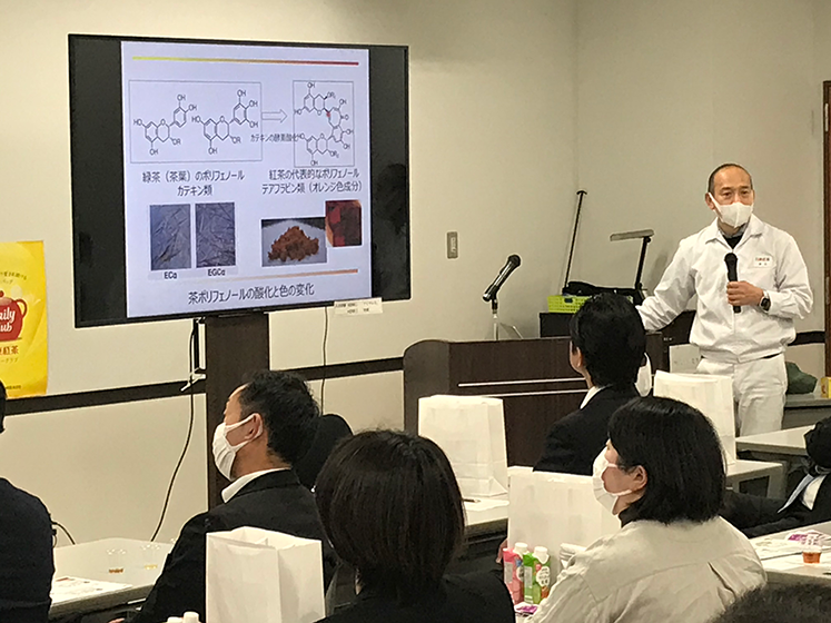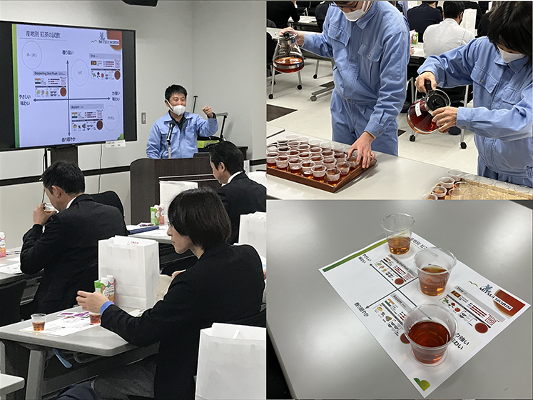 三井農林㈱様には工場見学の他にお茶に関する講習 ①お茶について(茶種、生産工程、発酵) ②キャラクターホイール(紅茶の香り、味、水色)の説明、紅茶の試飲を企画いただきました。