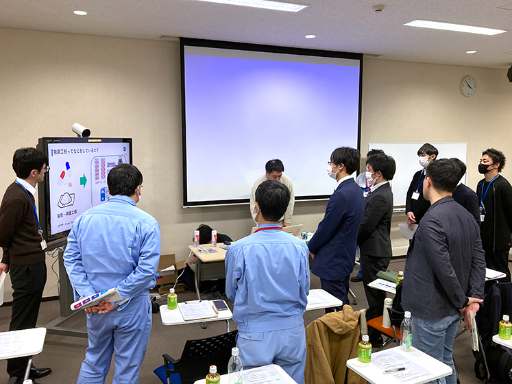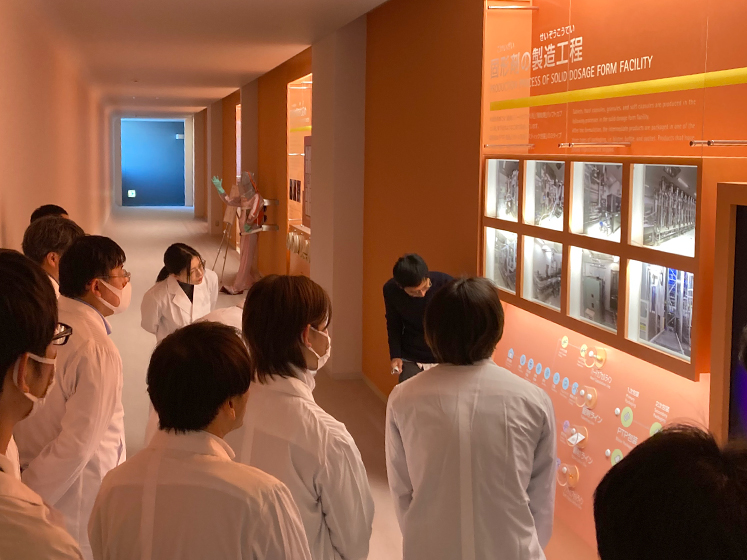 2024年度は中外製薬工業株式会社さまの協力を得て、現地での工場見学を催しました。工場見学では、くすりができるまでの流れについての講話、生産ラインの様子や品質管理の取り組みの見学に加えて、くすりづくりの体験(原薬、製剤、包装)もさせていただきました。