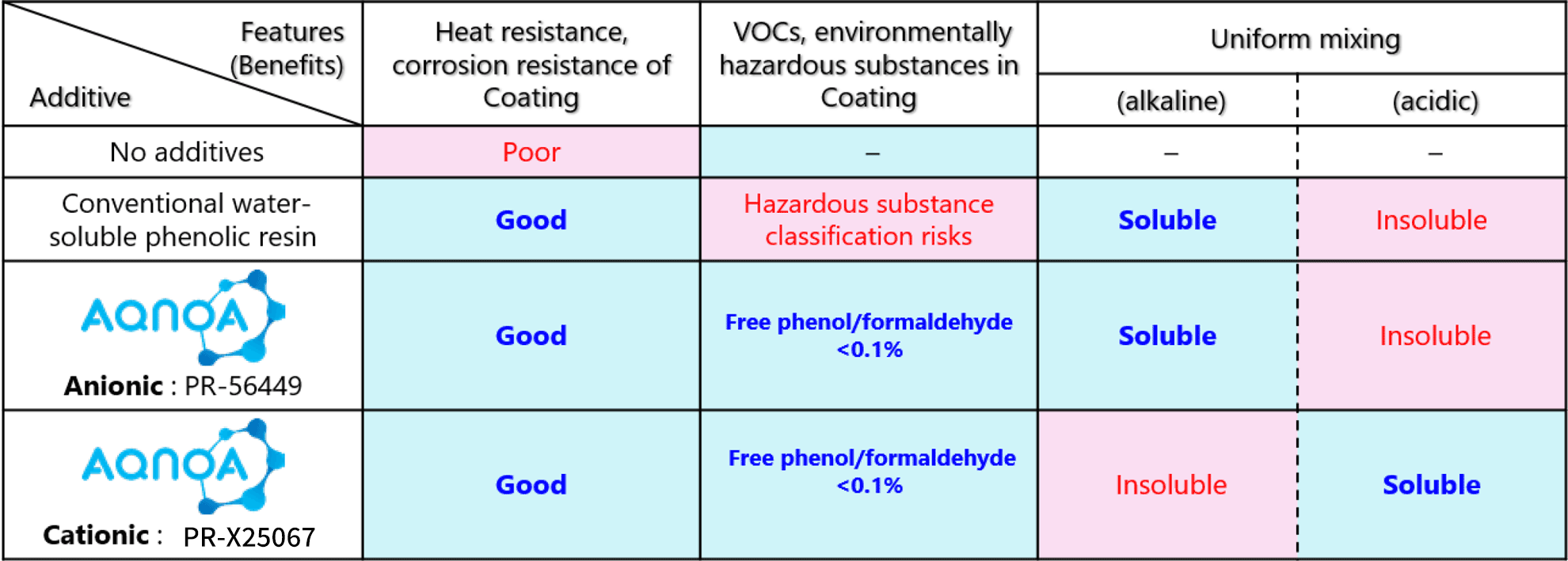 Conventional water-soluble phenolic resins contain high levels of phenol and formaldehyde, which may cause the added coating products to be classified as hazardous substances. However, as for AQNOA™, the phenol and formaldehyde content is less than 0.1%. We line-up both anionic and cationic types, enabling stable dispersion in various paint formulations.