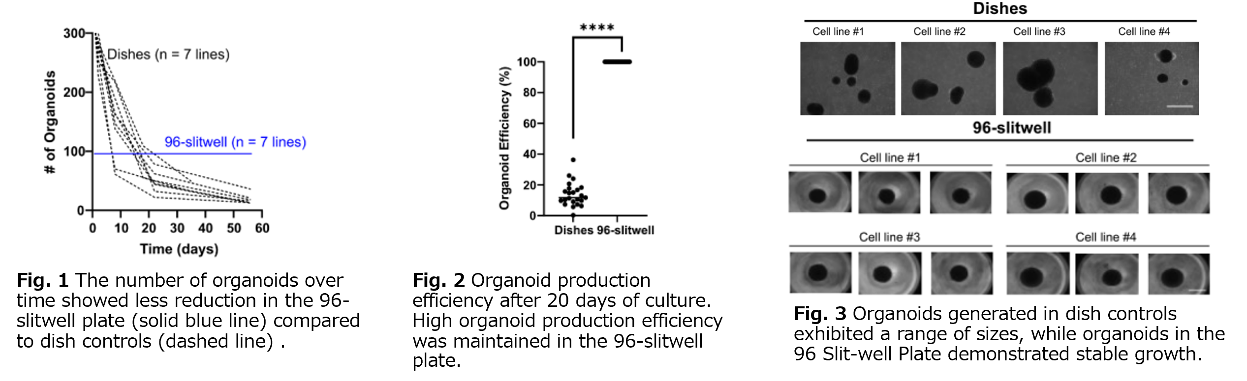 ・Organoids cultured in the 96 Slit-well Plate exhibited fewer numerical losses, afforded higher survival rates, and yielded uniform size and stable growth.