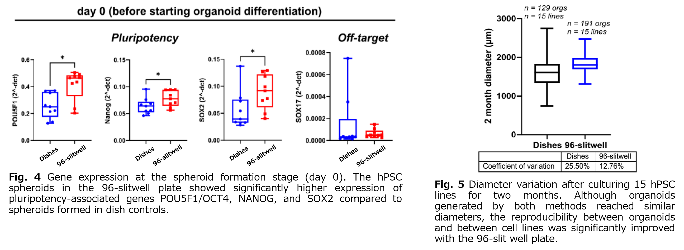 ・At the time of spheroid formation, spheroids generated in the 96 Slit-well Plate showed significantly higher pluripotency-related gene expression compared to the control group and demonstrated a more uniform size distribution across multiple hPSC lines in comparison to the control group.