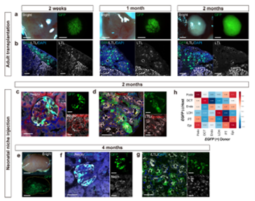 In this study, the group has developed the neonatal niche injection (NNI) method. This method proved to be highly approachable for generating chimeric nephrons by injecting renal progenitor cells (RPCs) and RPC spheroids produced by PrimeSurfaceTM into neonatal mice. These chimeric nephrons with a connection to the host urinary tract exhibit maturation levels comparable to host nephrons, remain viable over an extended period, and are valuable for evaluating nephrotoxicity. Furthermore, hiPSC-derived progenitor cells also differentiate into nephrons using this method. |