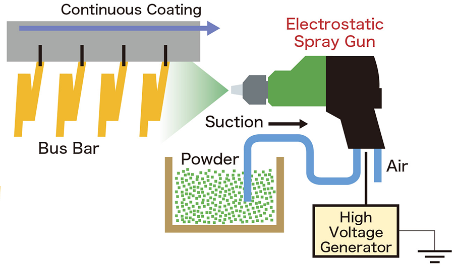 Electrostatic coating is suitable for powder coating on metal.Powder particles are attached to metal surfaces by electrostatic attraction using a spray gun or a fluidizing bed, then they are cured by heating.You can select areas to coat by masking.