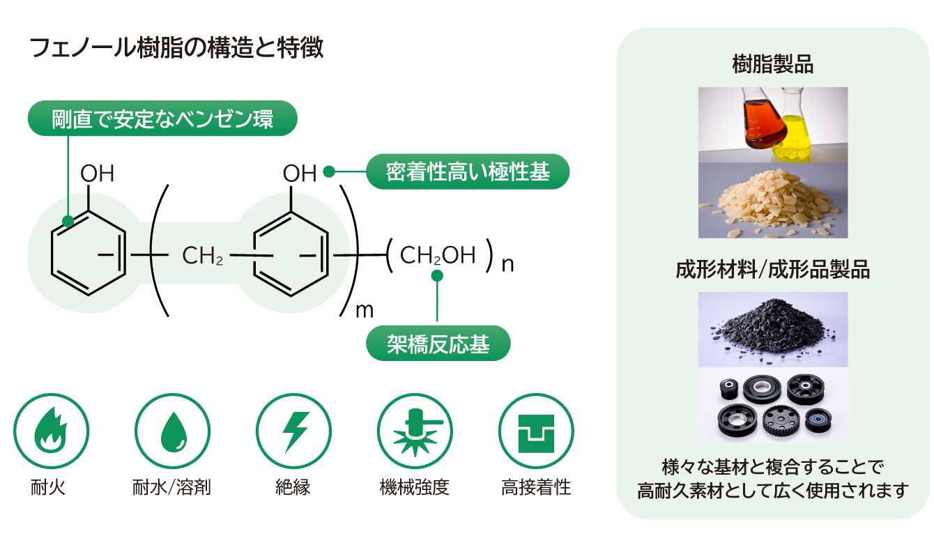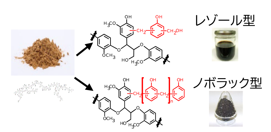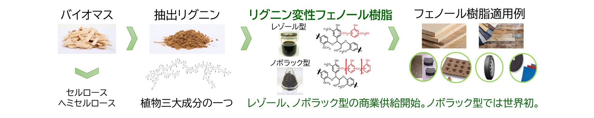 当社は多様なリグニンをフェノール樹脂に適切に組み込み、従来より高機能なバイオマスフェノール樹脂を開発して社会実装を進めております。