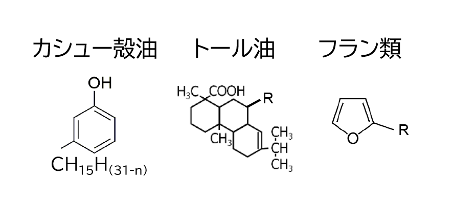 従来より様々な機能を付与したバイオマスフェノール樹脂を提供しており、バイオマス由来の柔軟性、疎水性、密着性を活かした用途に使用されております。