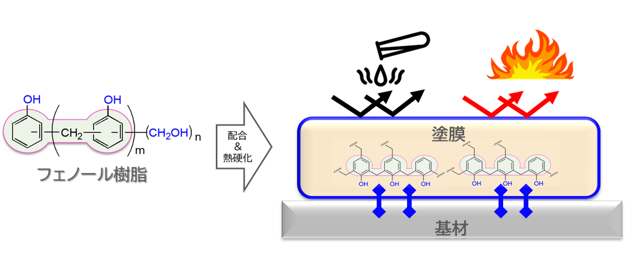 フェノール樹脂は密着性に優れたOH基を多く有することから、塗料や表面処理剤に添加することにより、熱硬化時に基材と塗膜をより強固に密着させ、塗膜の耐食性や耐熱性の向上に寄与します。