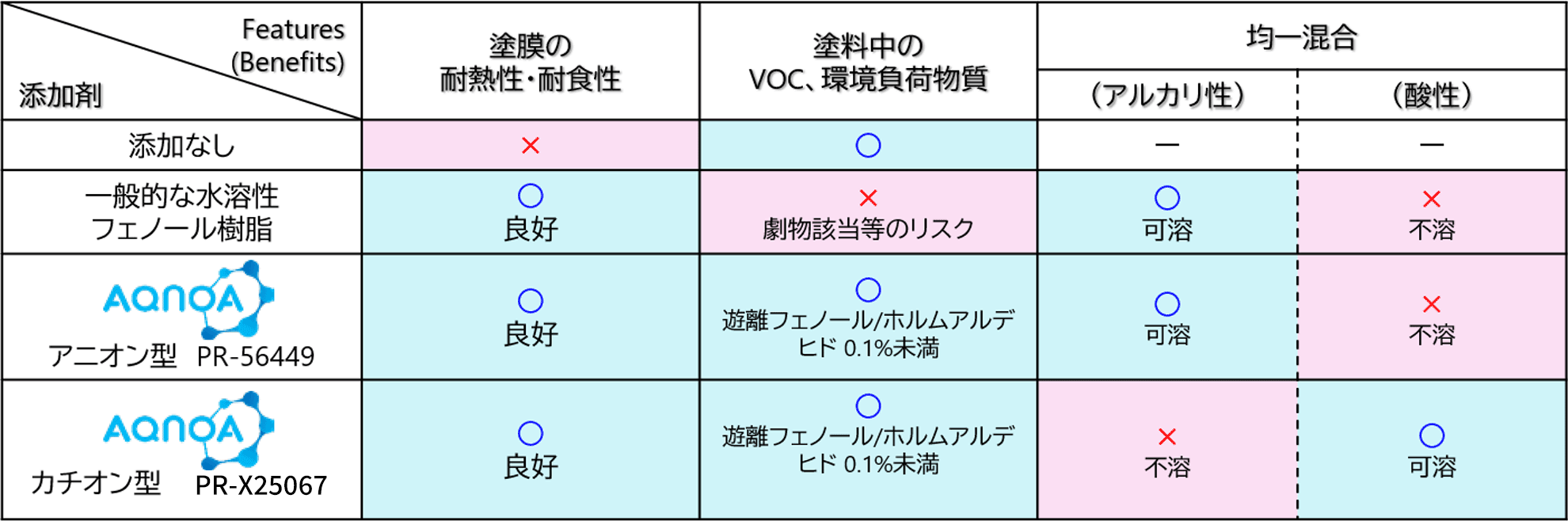 例として、各種水性塗料に、超低モノマー水溶性フェノール樹脂AQNOA™PR-56449を10%配合し、 150℃で20分乾燥・硬化させることで、以下のように特性が向上いたしました。