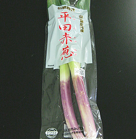 その冷え込みを待っていたかのように、今年も山形・庄内から「平田赤ねぎ」が市場出荷されてきました。ここ1~2年の鍋ブームで、各地の煮て美味しいネギ“煮ネギ”が注目を浴びていますが、その中でもとりわけ市場での引き合いが強いのがこの太い一本ネギ「平田赤ねぎ」。茎の鮮やかな紅色が大きな特徴ですが、生では辛みがあるものの、鍋に入れて火を通すと、びっくりするような甘みと柔らかさに変身するネギだからです。卸売市場では、一般の白ネギの2~3倍高い相場がつきますが、それでも買い受ける小売商や仲卸業者たちからは「もっと出荷してほしい」といわれているほどのネギなのです。