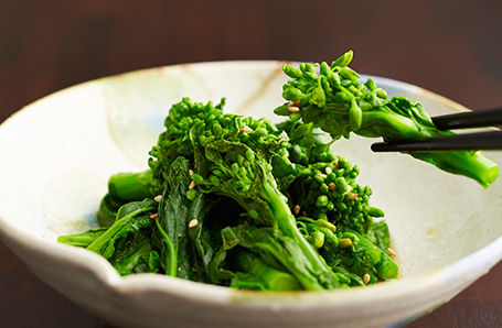 春の訪れを感じさせる野菜類の代表格といえば、やはり菜の花でしょう。とくに関東地方では春一番が吹き始める3月ごろに本格的な出荷期を迎え、4月に向けピークとなります。いかにも柔らかそうな淡い緑色の葉茎に、黄色い花が咲く前の蕾がついて、新緑、芽吹きといった季節性を具現化した、見ているだけで春の到来を知らせてくれる野菜です。